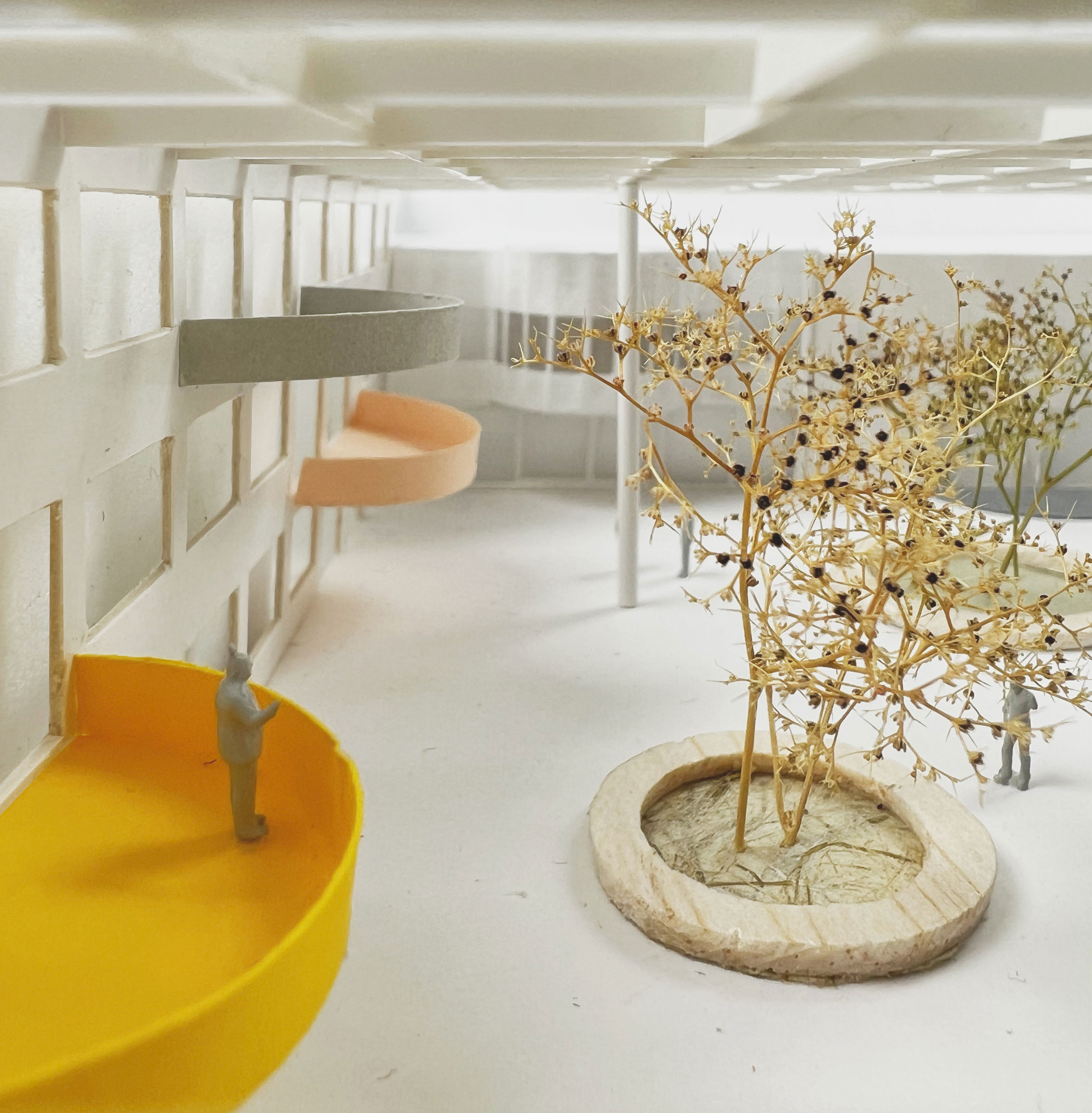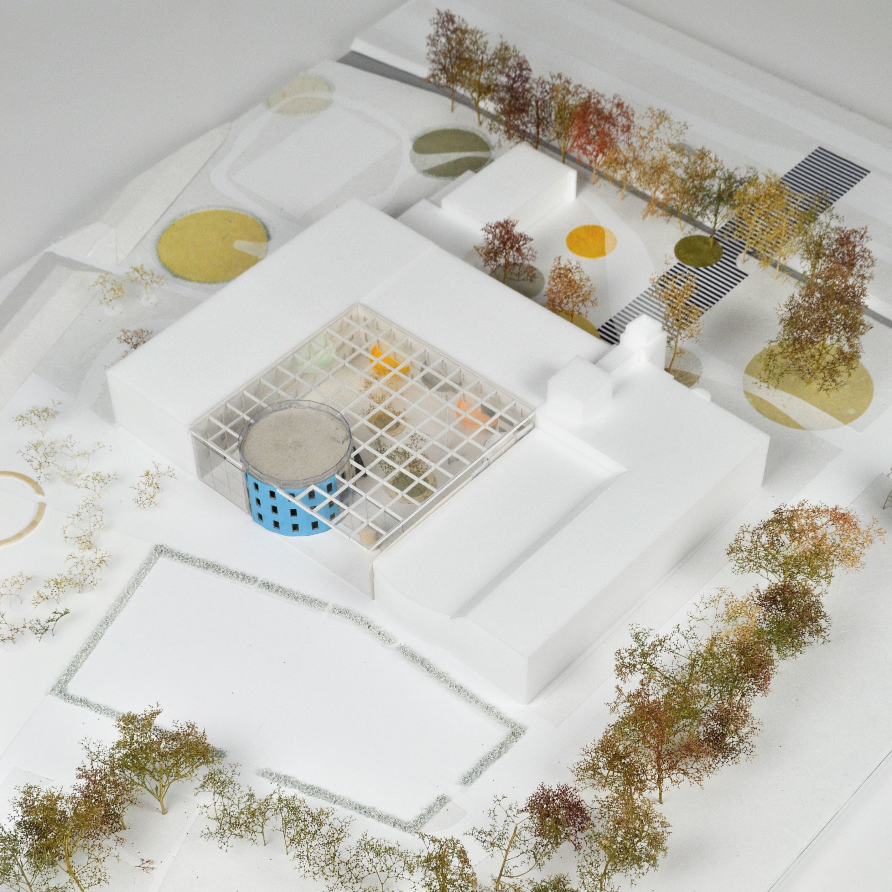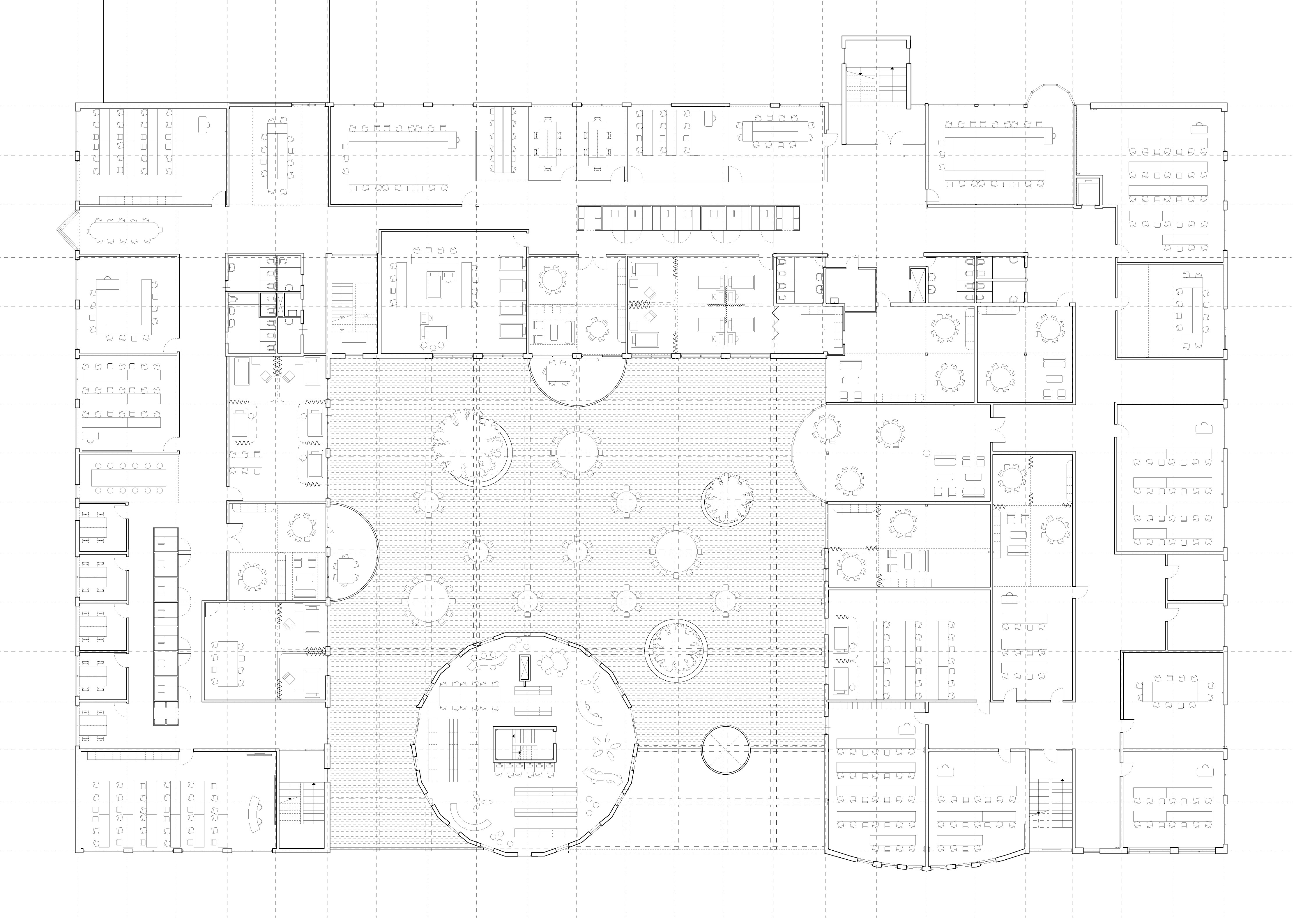 Het nieuwe ruimtelijk plan richt zich op het versterken van de binnenplaats van het gebouw als ontmoetingsplaats tussen de verschillende gebruikers, waardoor deze het nieuwe hart van het gebouw wordt. De ruimte is een binnenruimte geworden door het te overdekken met een glazen dak en glazen wanden te laten aansluiten op de postmoderne toren. De maatvoering sluit aan op de oorspronkelijke maatvoering van de constructie. Een deel van de mediatoren is nu een binnengevel geworden; daarom zijn de gevelelementen aan deze zijde van de gevel verwijderd, zodat de betonnen constructie in het zicht komt en de ingreep visueel nog eens benadrukt.