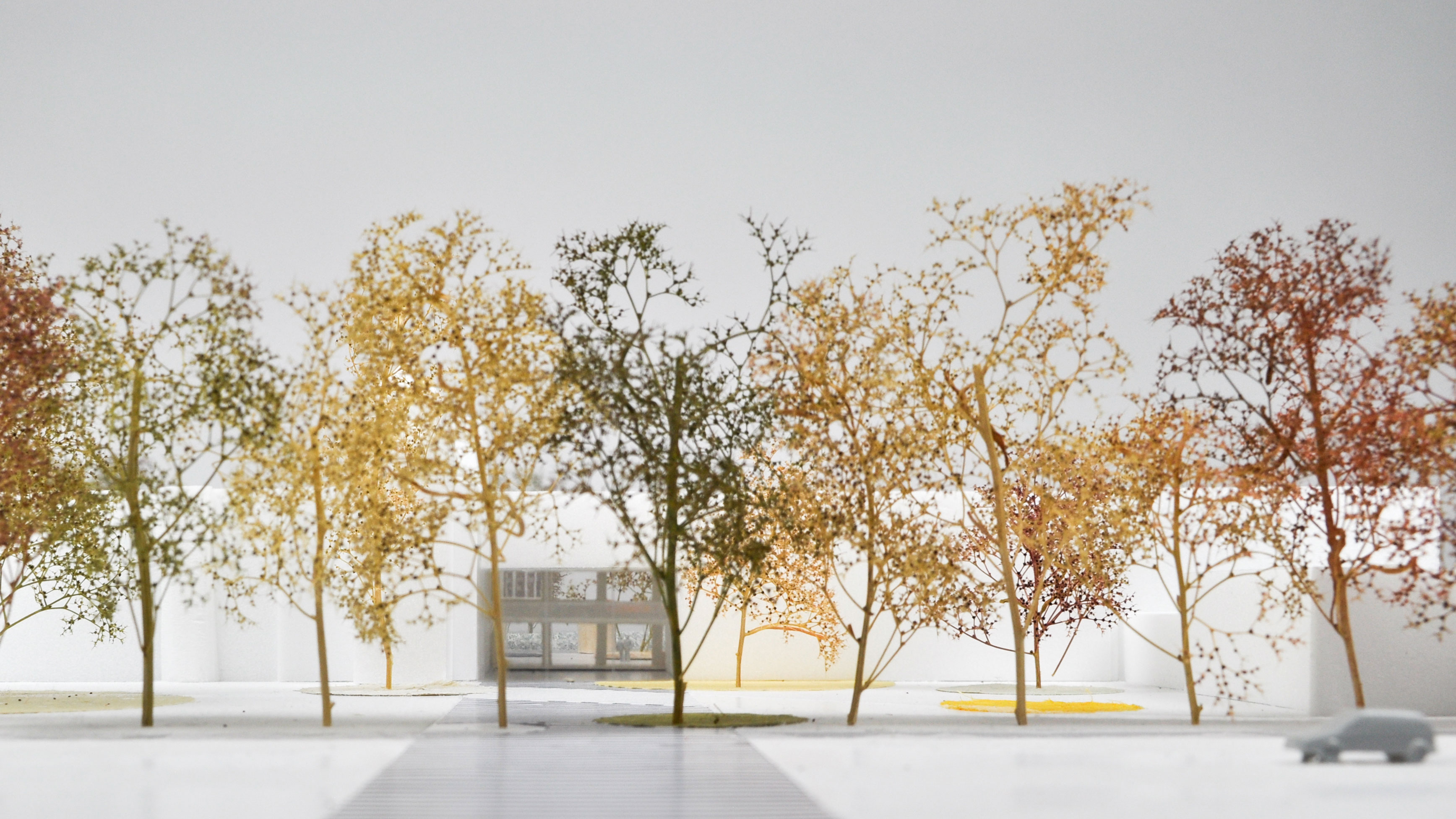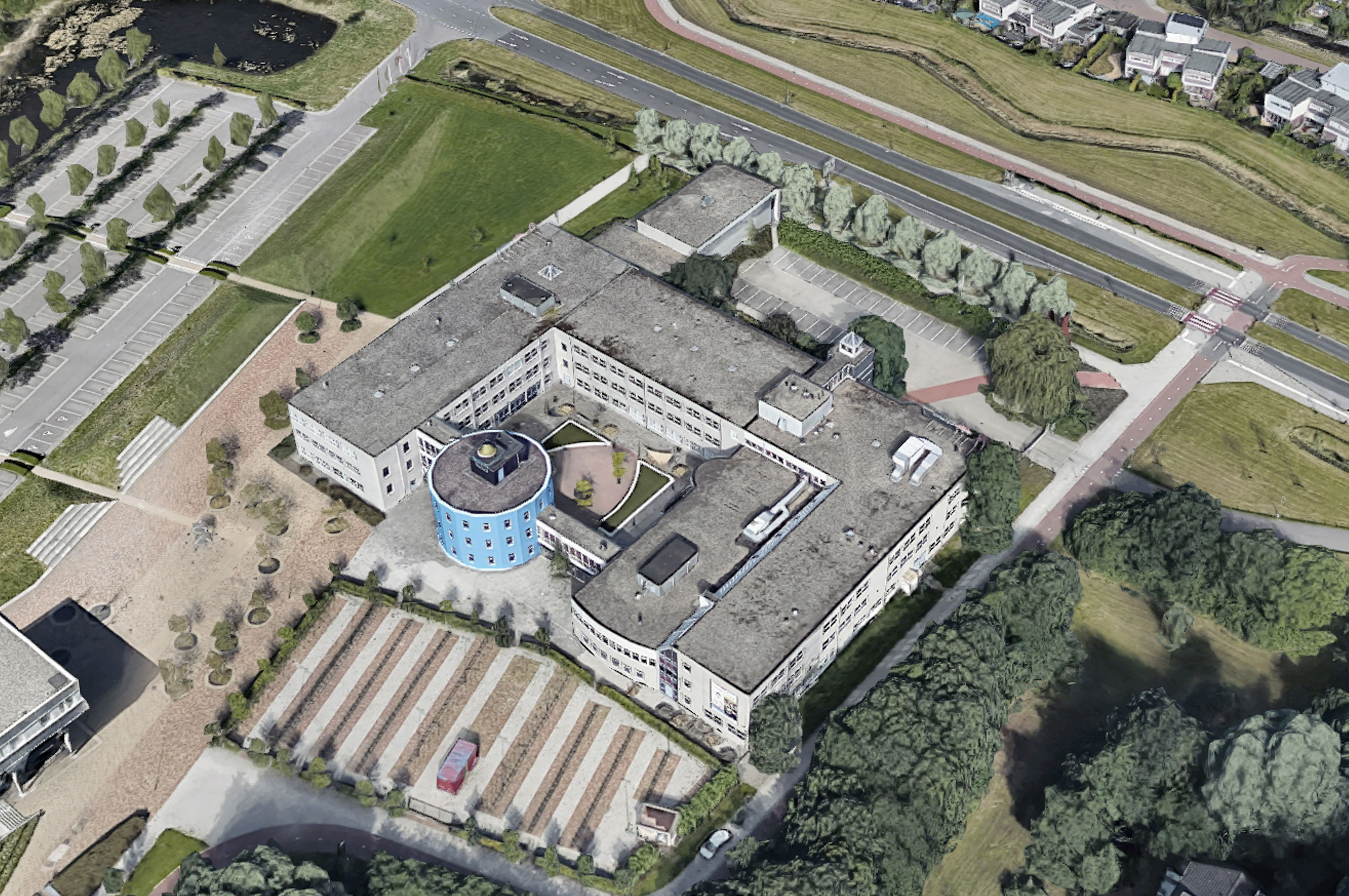 Het voorstel verplaatst ook de bushalte naar het noorden van het gebouw, waardoor een directe visuele en functionele relatie ontstaat tussen de entree van het gebouw en de binnenplaats. Om de entree van het gebouw te markeren, wordt het momenteel saaie, verharde gebied rondom de entree gerenoveerd tot een nieuw openbaar plein. Meer beplantingen en bomen in cirkelvormige vlakken op dit voormalig geasfalteerde plein, versterken en verbeteren de waterbestendigheid en biodiversiteit van de openbare ruimte.