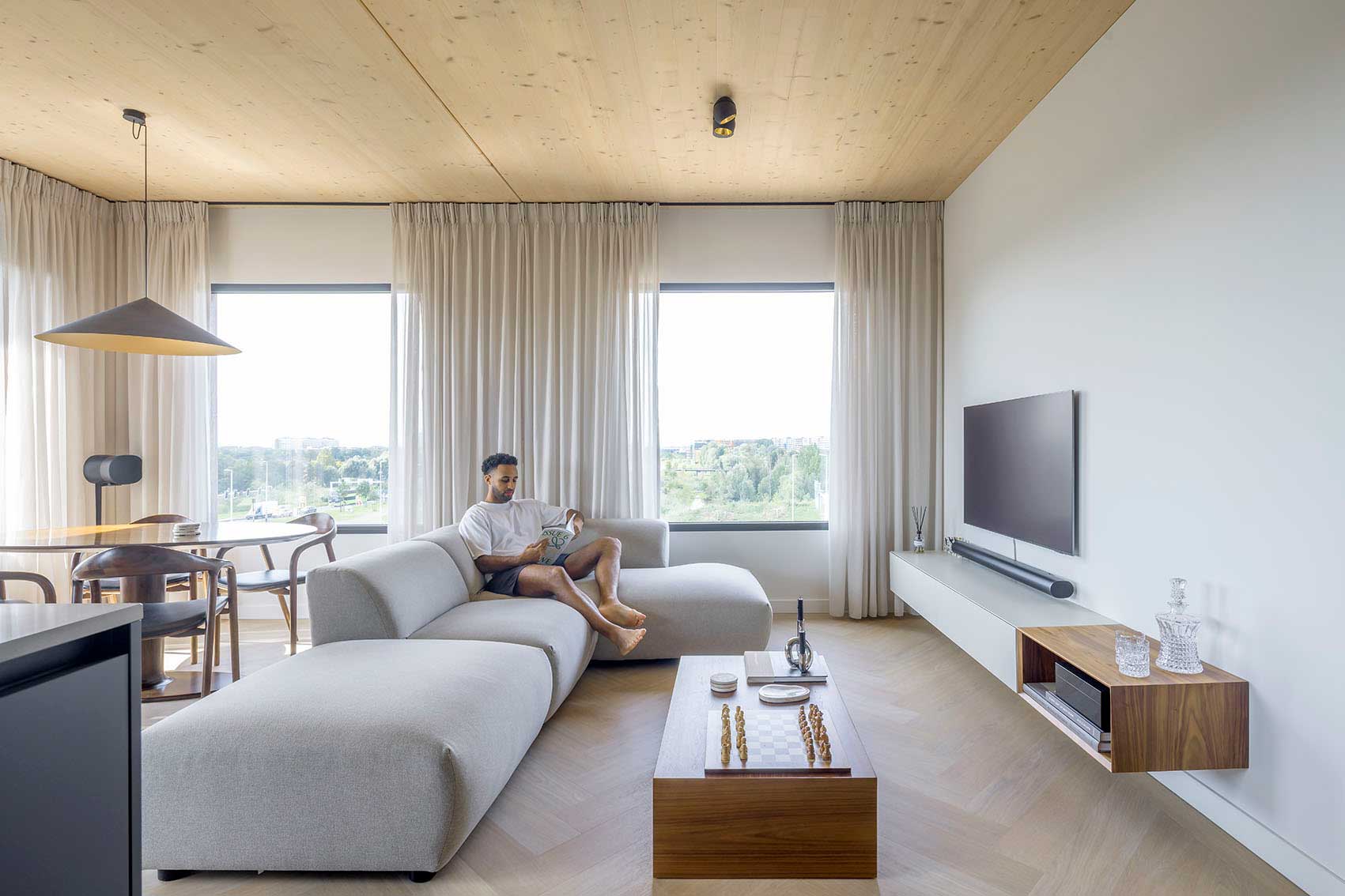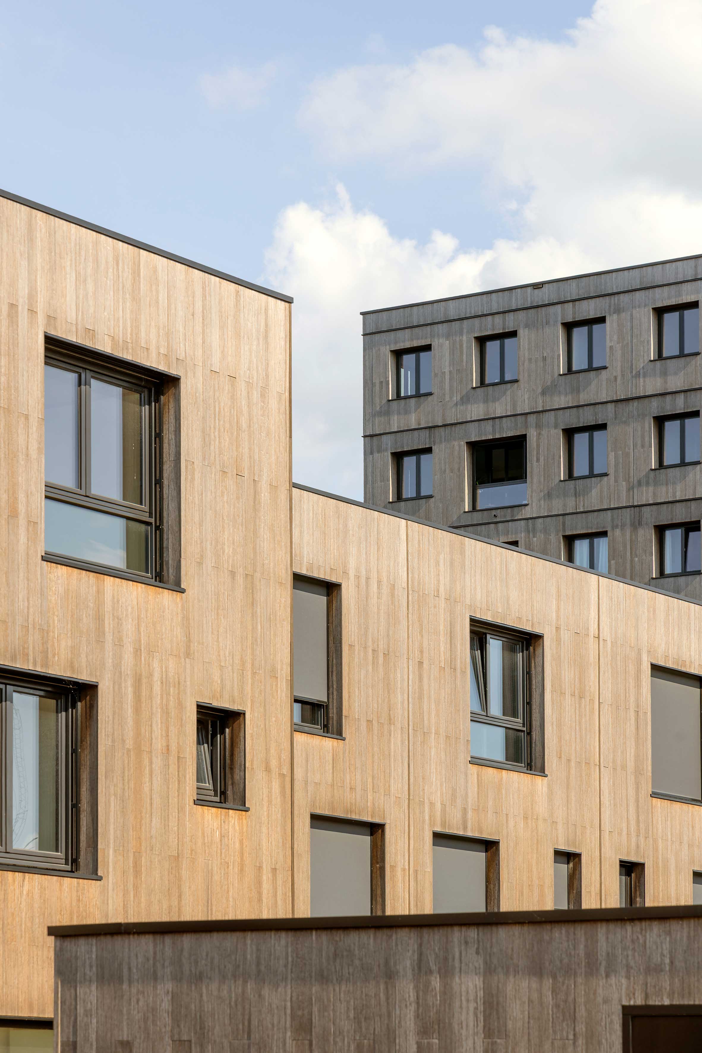 Integral sustainability has been a central theme, with architecture, urban design and public space offering a shared response to contemporary environmental ambitions. The architecture of Switi links sustainable design principles to the ideals of 1970s modernism: building in the spirit of the time, using modern materials and industrial techniques. Except for the foundation, Switi is entirely biobased. The structures of both the low-rise blocks and the tower, including stairwells and lift cores, are made of cross-laminated timber. The façades are insulated with wood fibre, while bamboo cladding and square loggias bring coherence to the ensemble. The project was prefabricated in 2D elements and assembled on site in just four months, including façades, window frames, solar shading, internal walls and fireproof components.