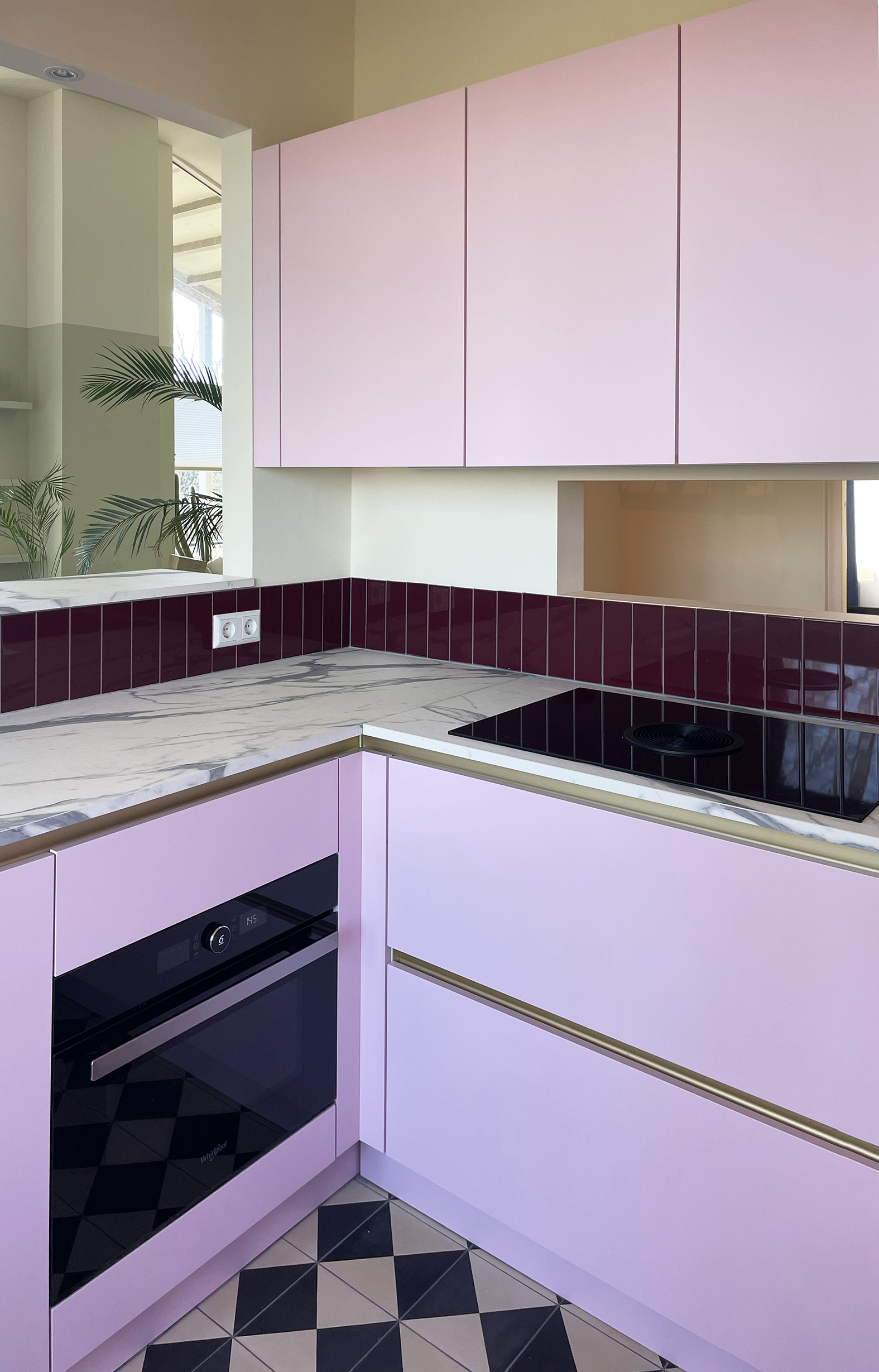 Since the kitchen would have this prominent function, we decided that every room, from kitchen to toilet, would have its own style, patterns, color scheme and atmosphere so that it is a treat to be in any of the rooms of the apartment. To enhance the idea that the apartment becomes a whole rather than a collection of rooms, two voids are created in two different walls so that diagonal sightlines from the living area to the kitchen and from kitchen via the entrance hall into the bedrooms are introduced causing the effect that the eye travels through the apartment. Creating a direct connection of the kitchen with the living room not only makes the kitchen bigger and more functional but also creates a more spatial and dynamic routing through the apartment. The eclectic choice of colors and patterns defines both the function of the specific rooms as well as the character of the inhabitant.