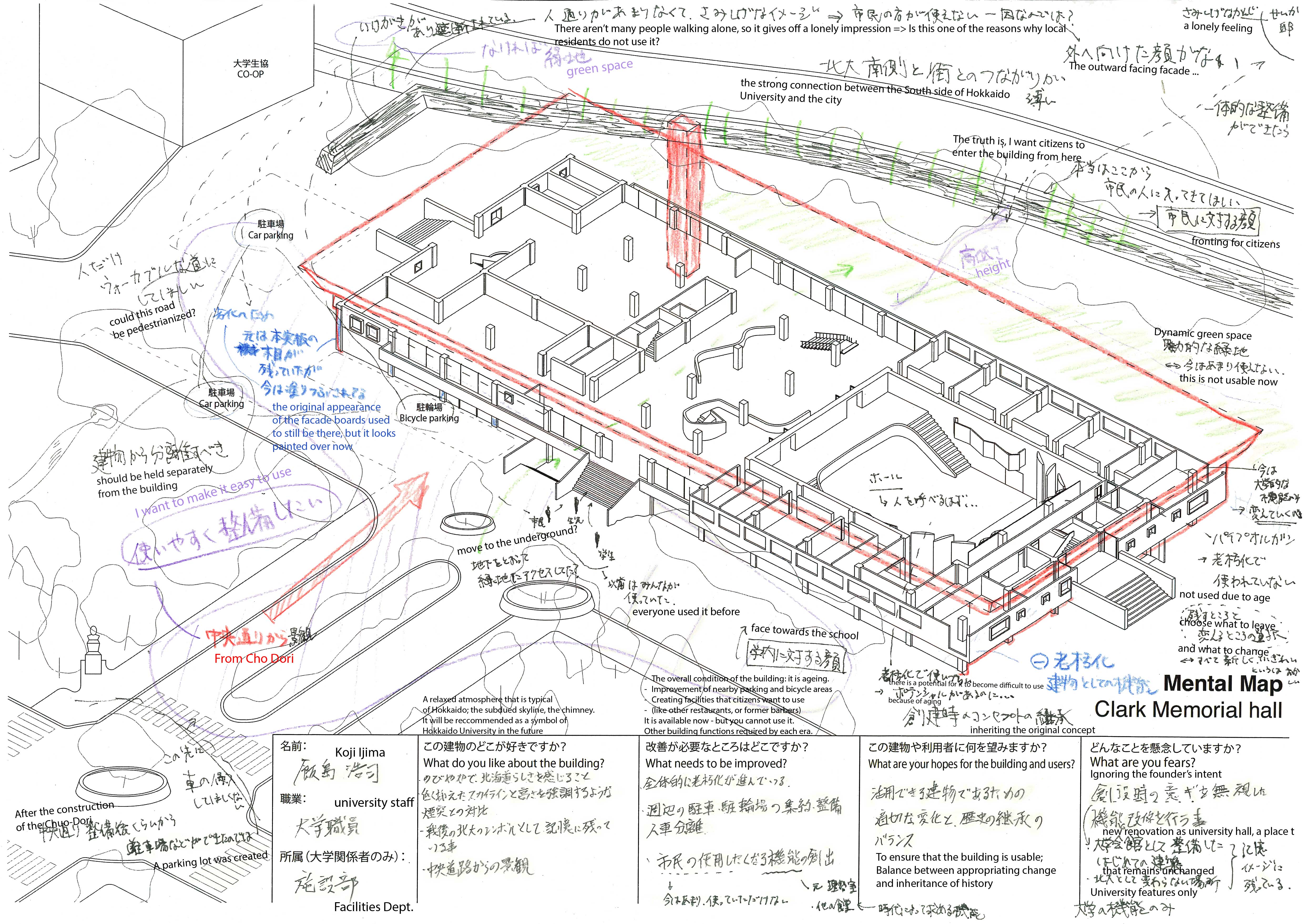 The research Re-Thinking Re-Use also shows that the built environment may appear objective, but that the experience of it is deeply personal and shaped by culture. To explore this, HOH Architecten, together with Japanese and Dutch partners, organised a series of workshops in Amsterdam, Tokyo, Sapporo and Kurashiki. Through Mental Maps (personal drawings and maps created by residents and users) existing values were uncovered that could serve as a foundation for the future development of buildings and neighbourhoods.