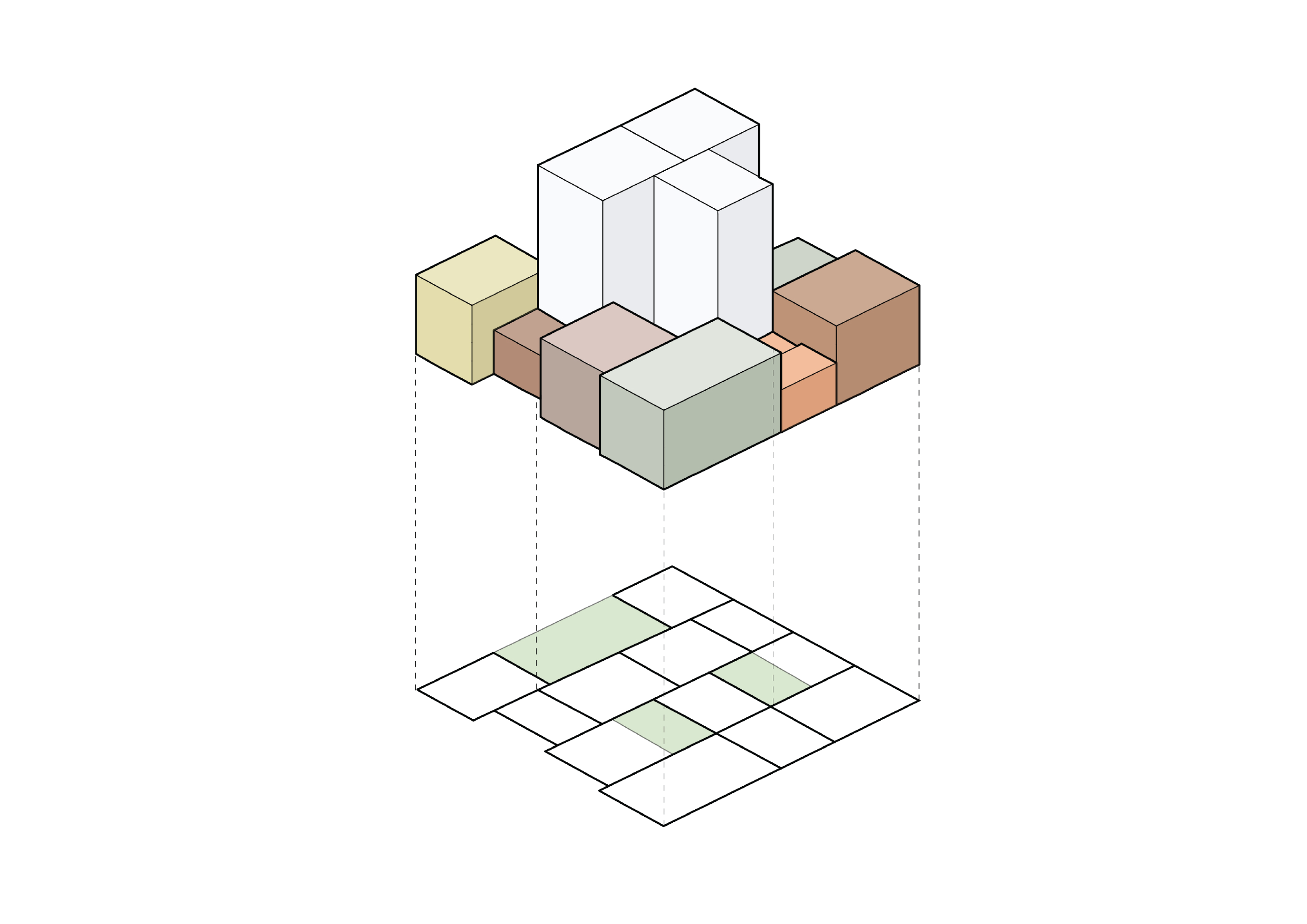 The small size of the volumes makes it possible to respond specifically to the diverse surroundings, giving spatial quality to the homes in the plinth and the apartments in the residential tower through side-lines, while allowing light and air into the cluster.