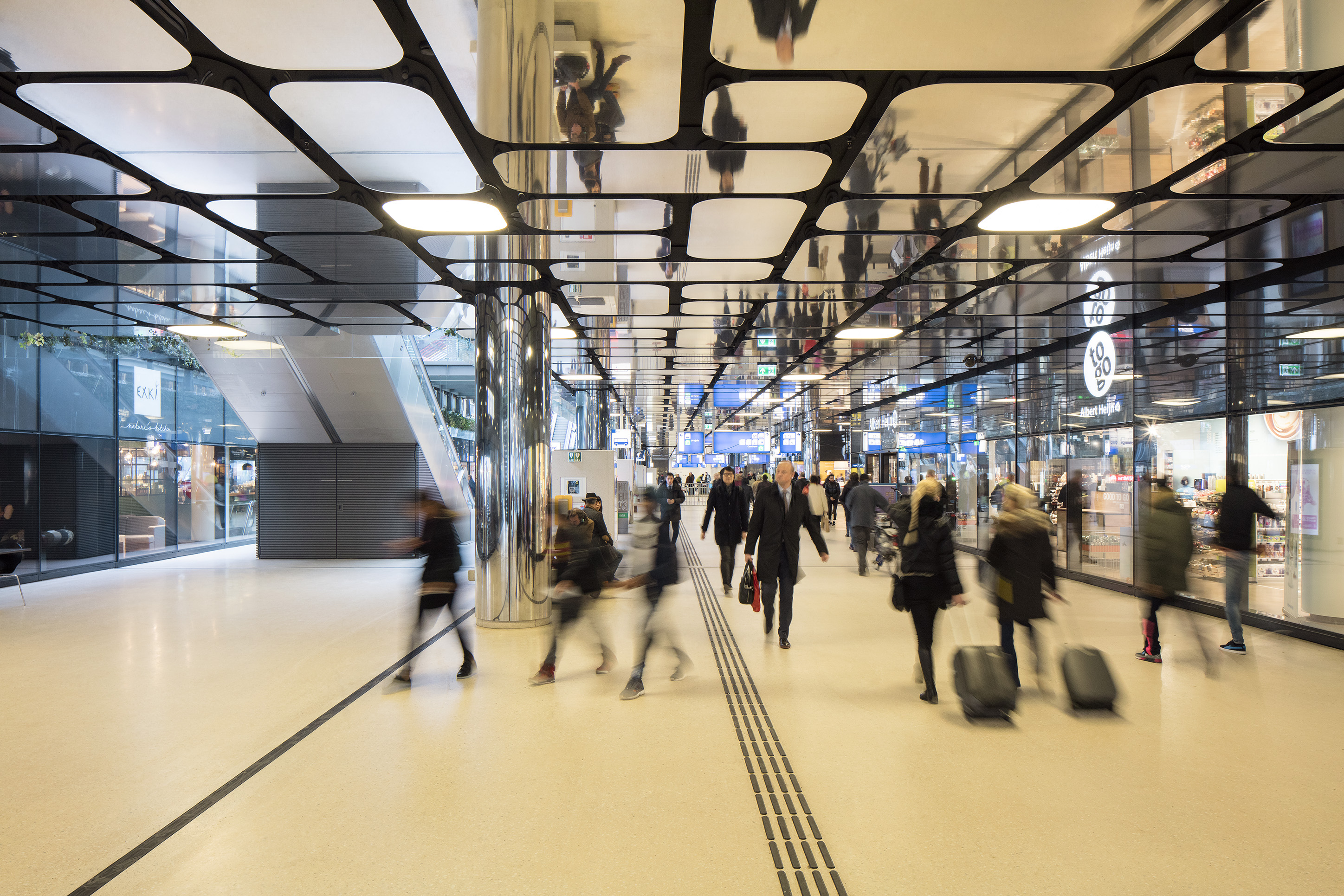 Since the pedestrian passageway is relatively low, the ceiling is adorned with mirroring elements. These are placed in a bespoke pattern, creating space for installation components in between the elements onto the black acoustic surface in the shadow of the mirroring elements. Due to the mirroring effect, the space appears to be endlessly continuous. The elements also remind us of splashes of water from the adjacent water of ‘t IJ and reflect the light outside – making the initially dark transfer hall a source of light.