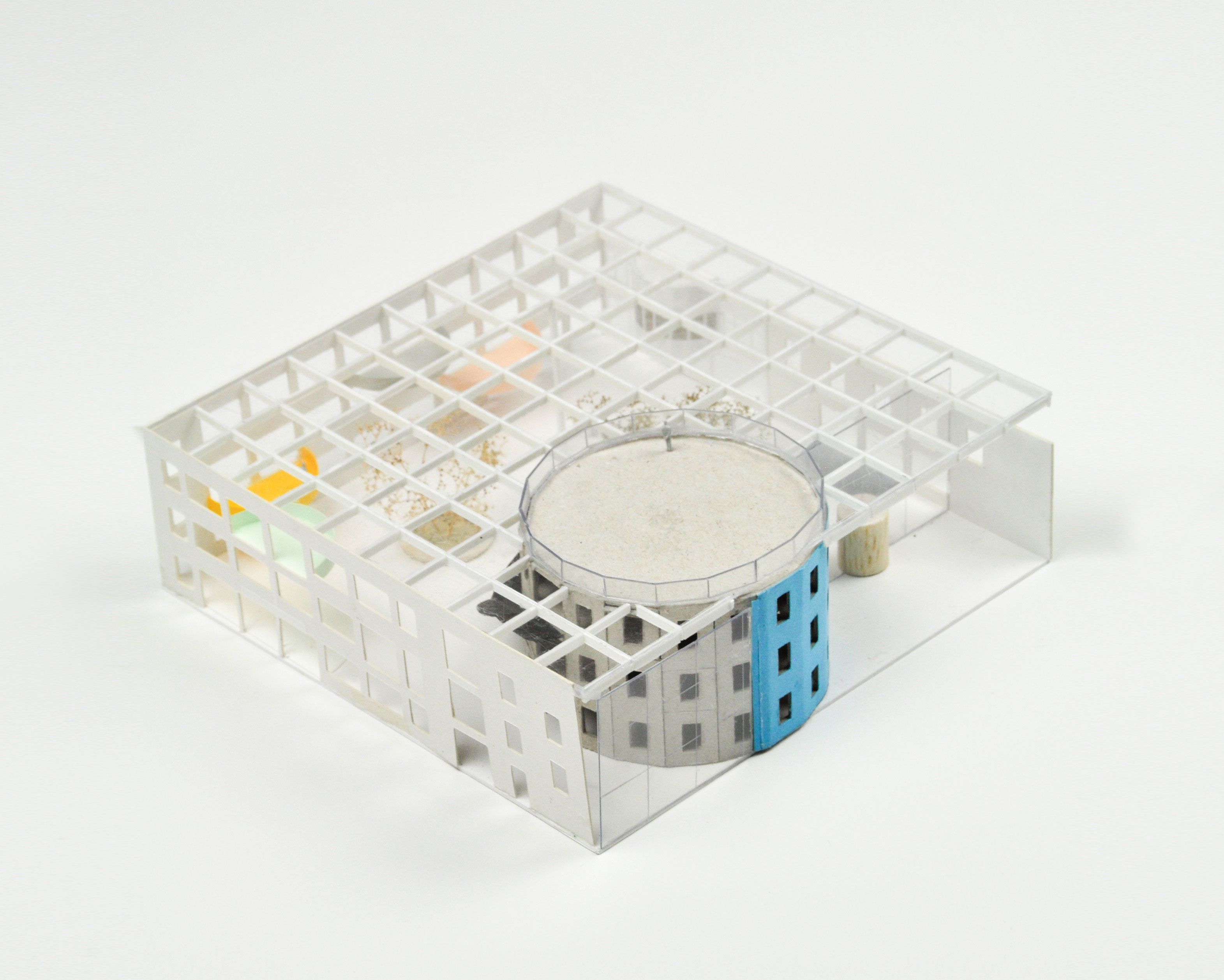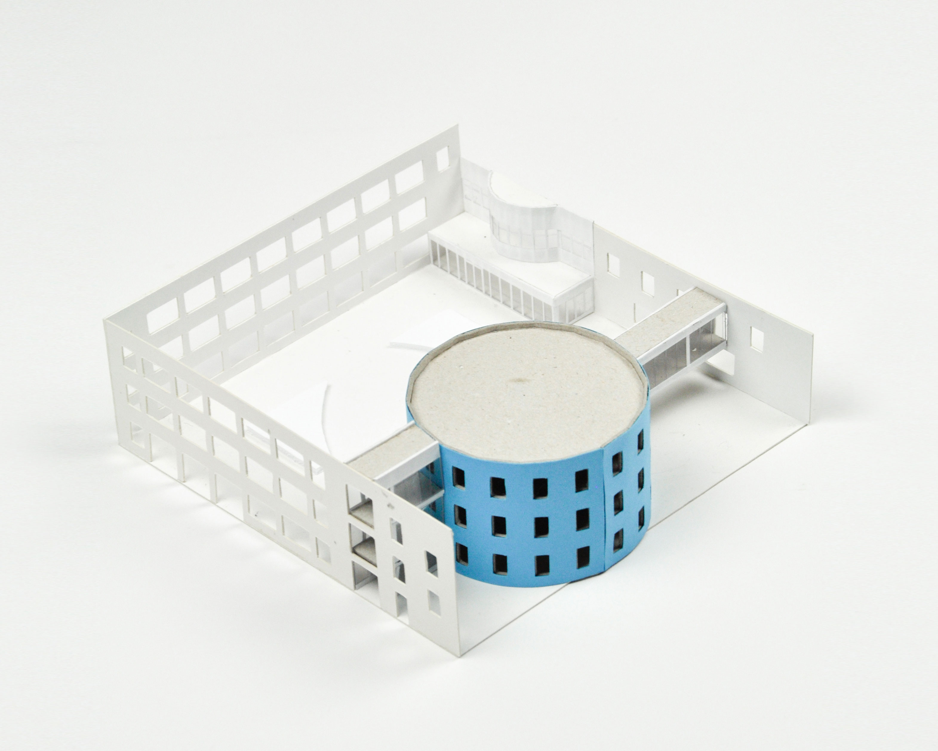 A renovation in 1996 extended the building to the West with a new wing that enclosed additional teaching halls, and to the South with a postmodern extruded cylinder enclosing a mediatheque. The new plan replaced the main entrance of the building, thus removing the direct axis that linked it to the ‘Shopping square’ of the building. Supporting functions replaced the practice rooms around the former ‘Shopping square’, the void above the square was closed and the original logic of the building was re-shuffled. The current plan is centered around the new courtyard, which is disconnected from the main entrance. As a result, most students often enter the building via the secondary entrance to the South, creating a confusing arrangement.