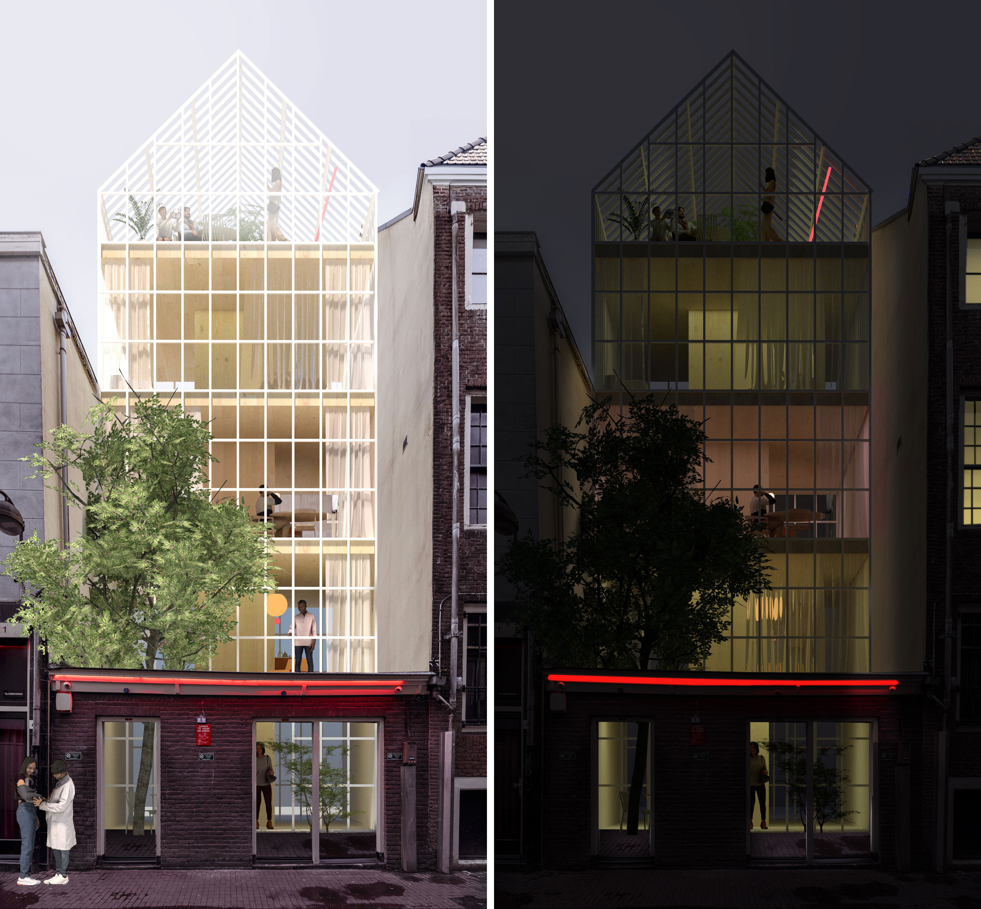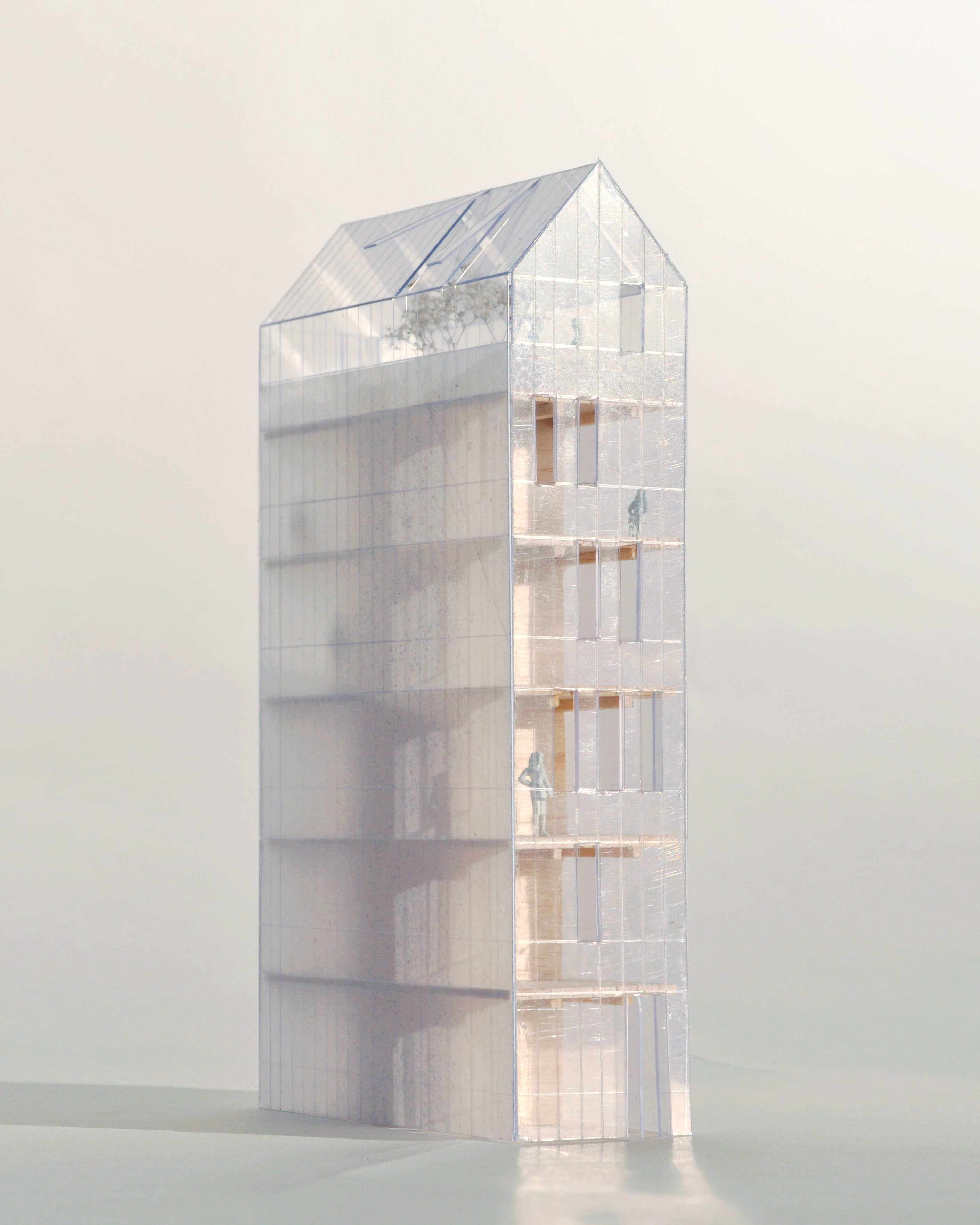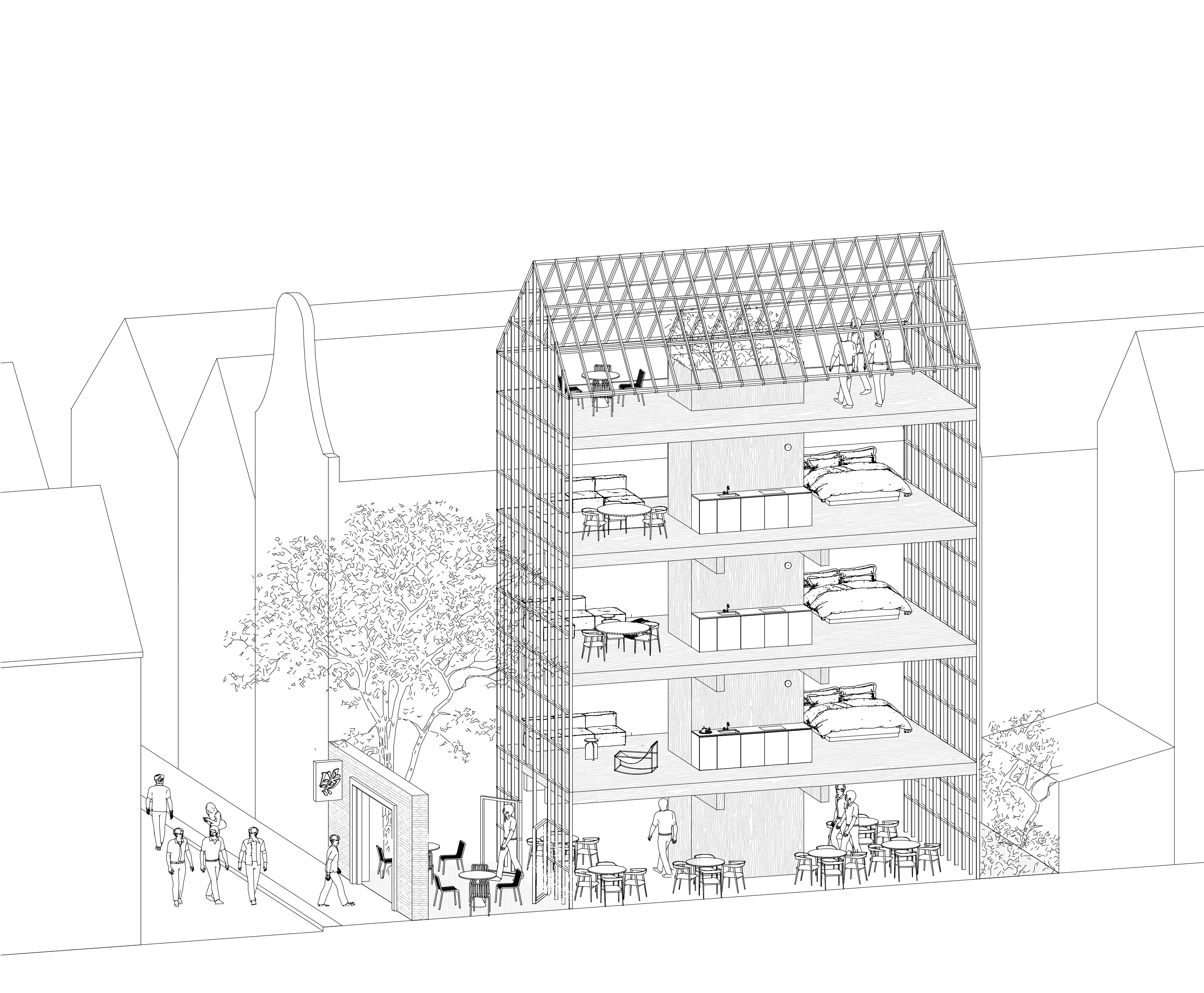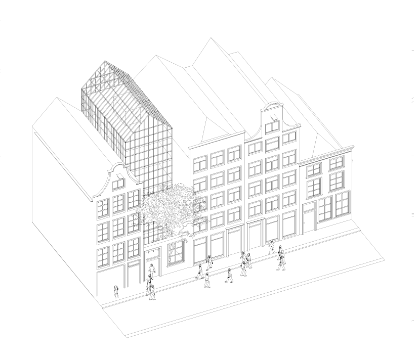 The façade is composed as a light glass curtain wall. The neighbourhood’s characteristic pitched roof transforms at the top level into a greenhouse, functioning as a collective indoor-outdoor space for residents. Elevated above its surroundings, this space offers views across the city and acts as a subtle beacon within the historic centre.