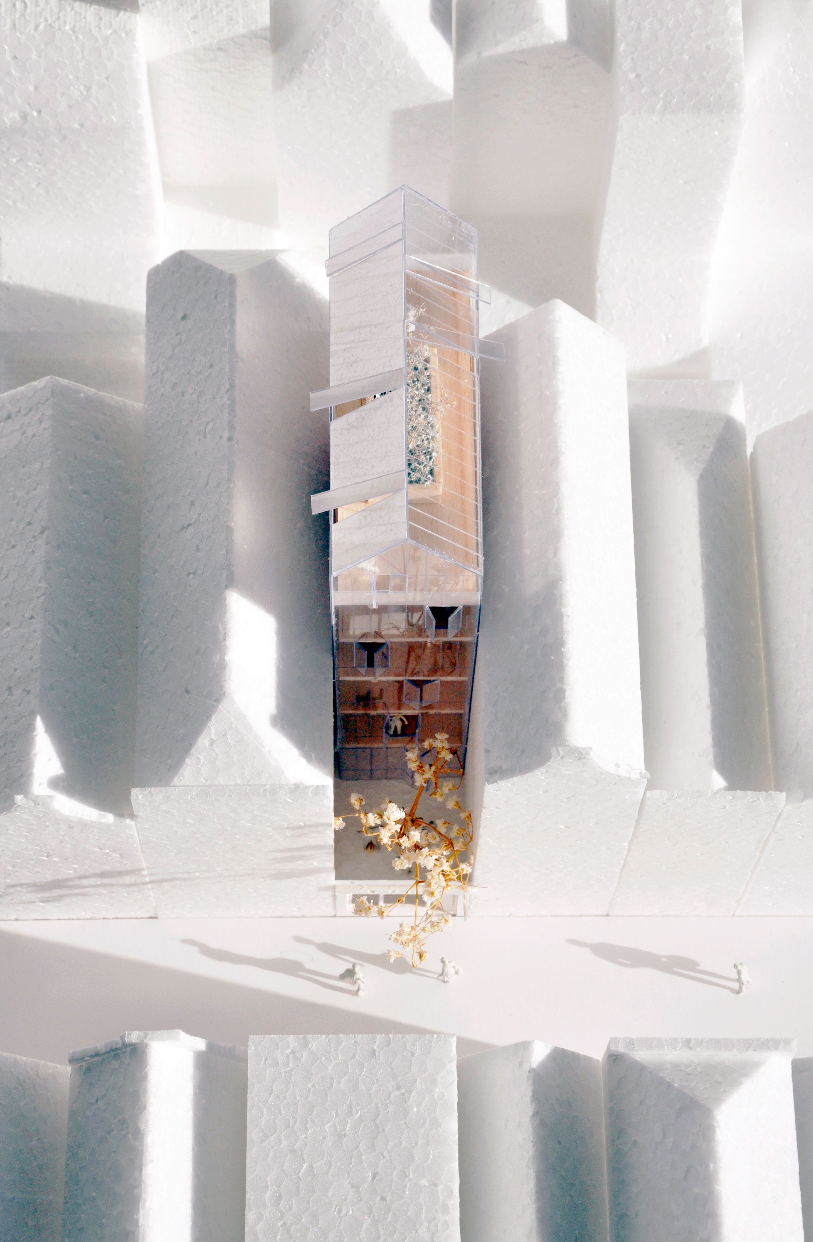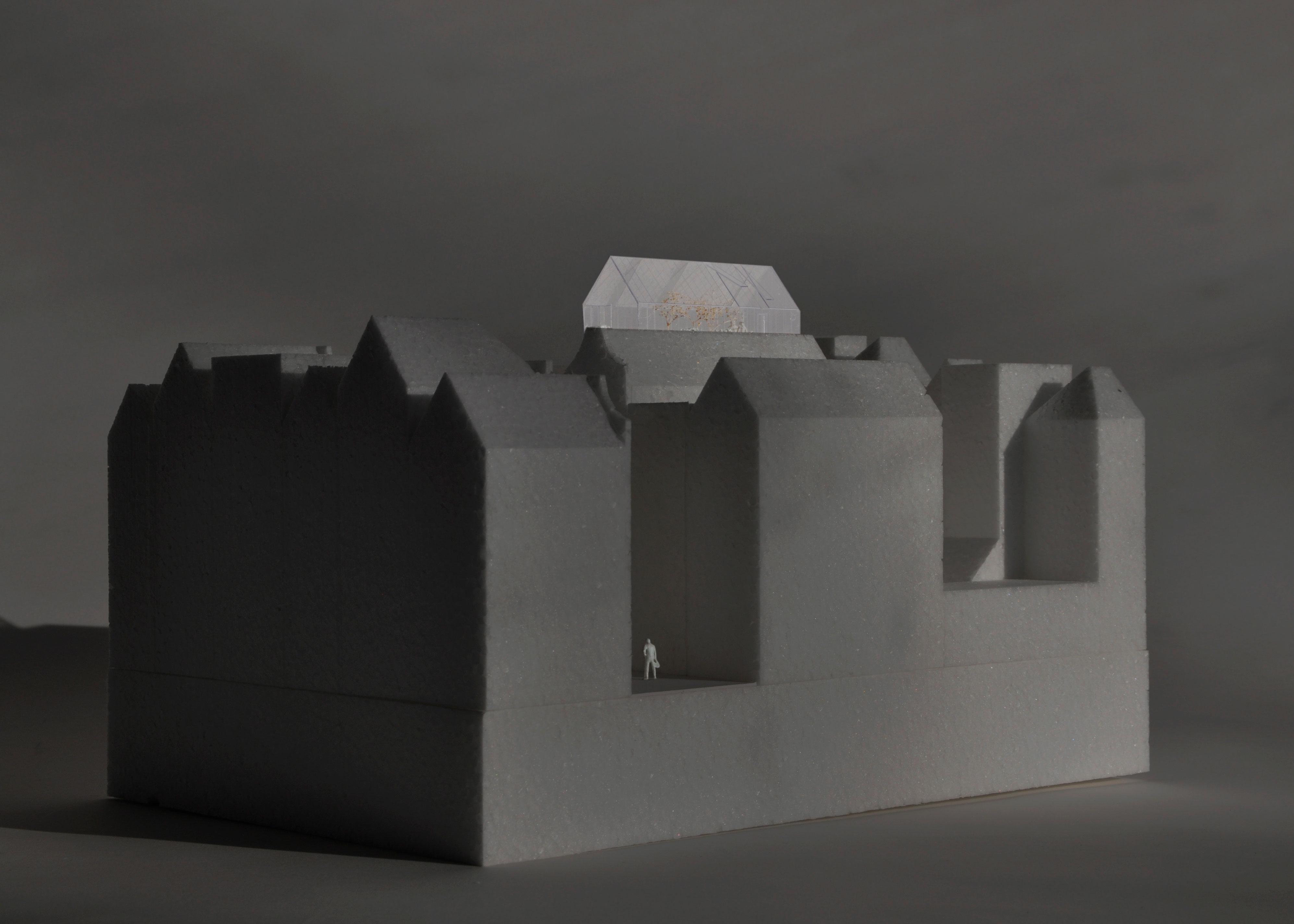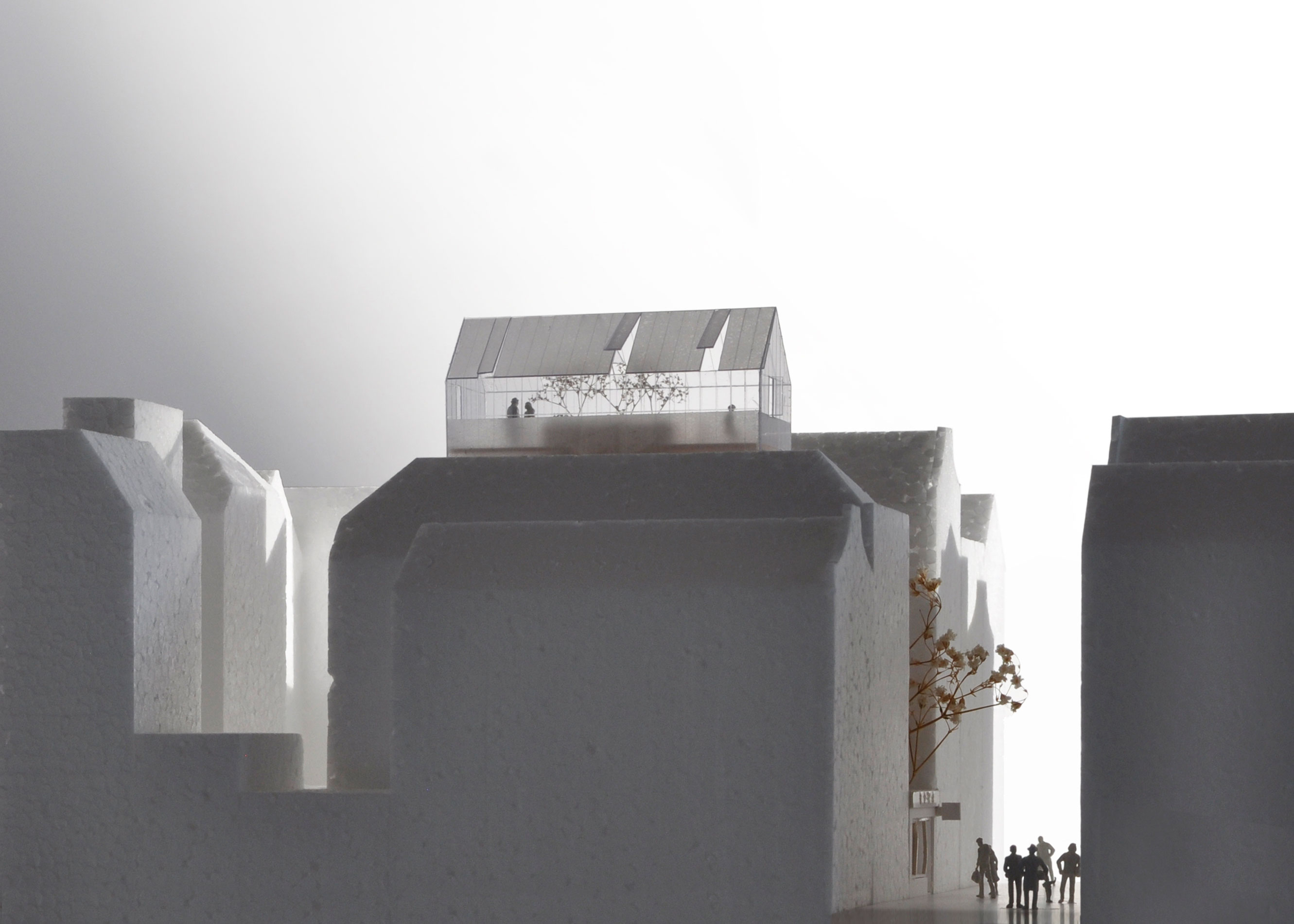 The façade is composed as a light glass curtain wall. The neighbourhood’s characteristic pitched roof transforms at the top level into a greenhouse, functioning as a collective indoor-outdoor space for residents. Elevated above its surroundings, this space offers views across the city and acts as a subtle beacon within the historic centre.