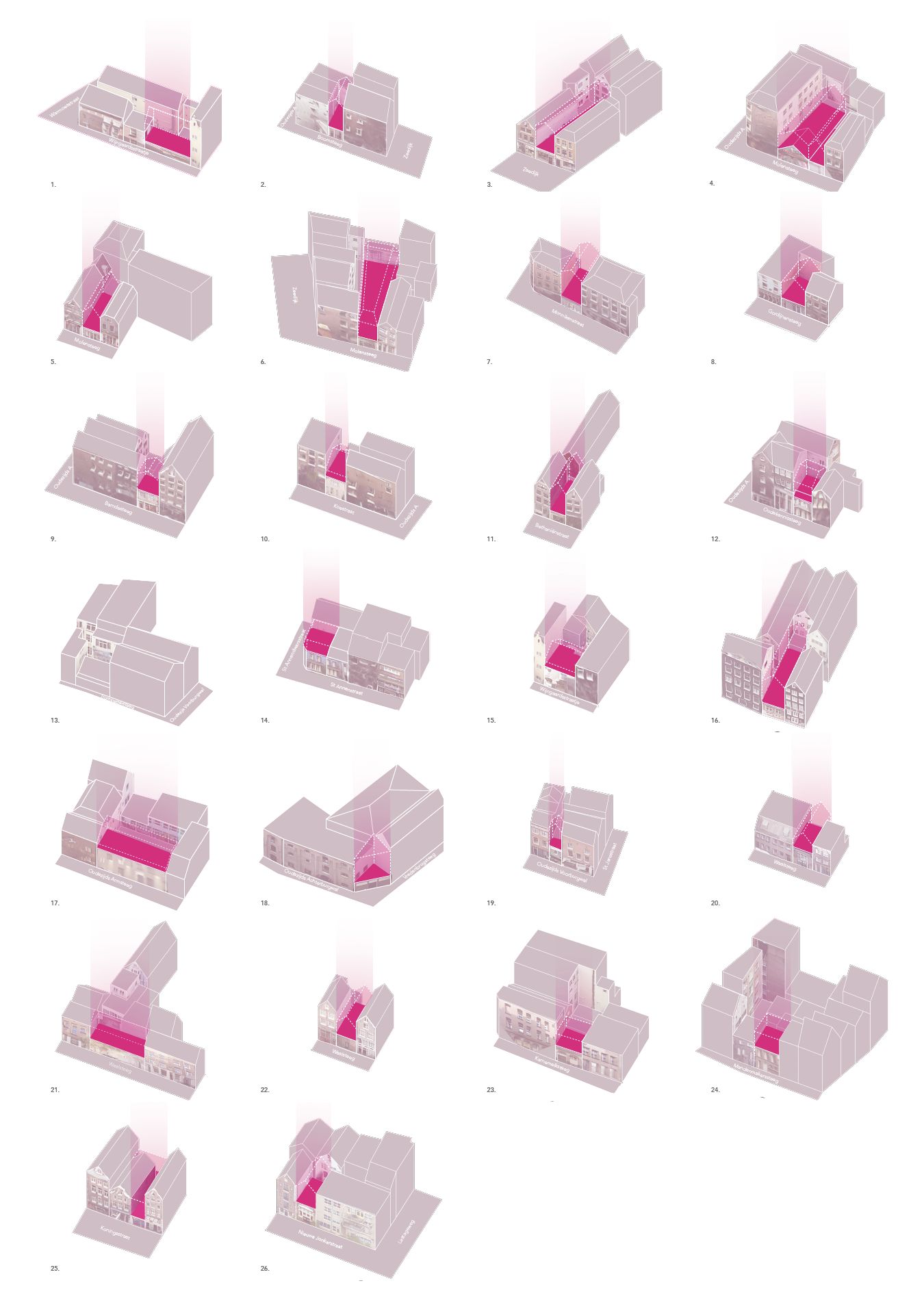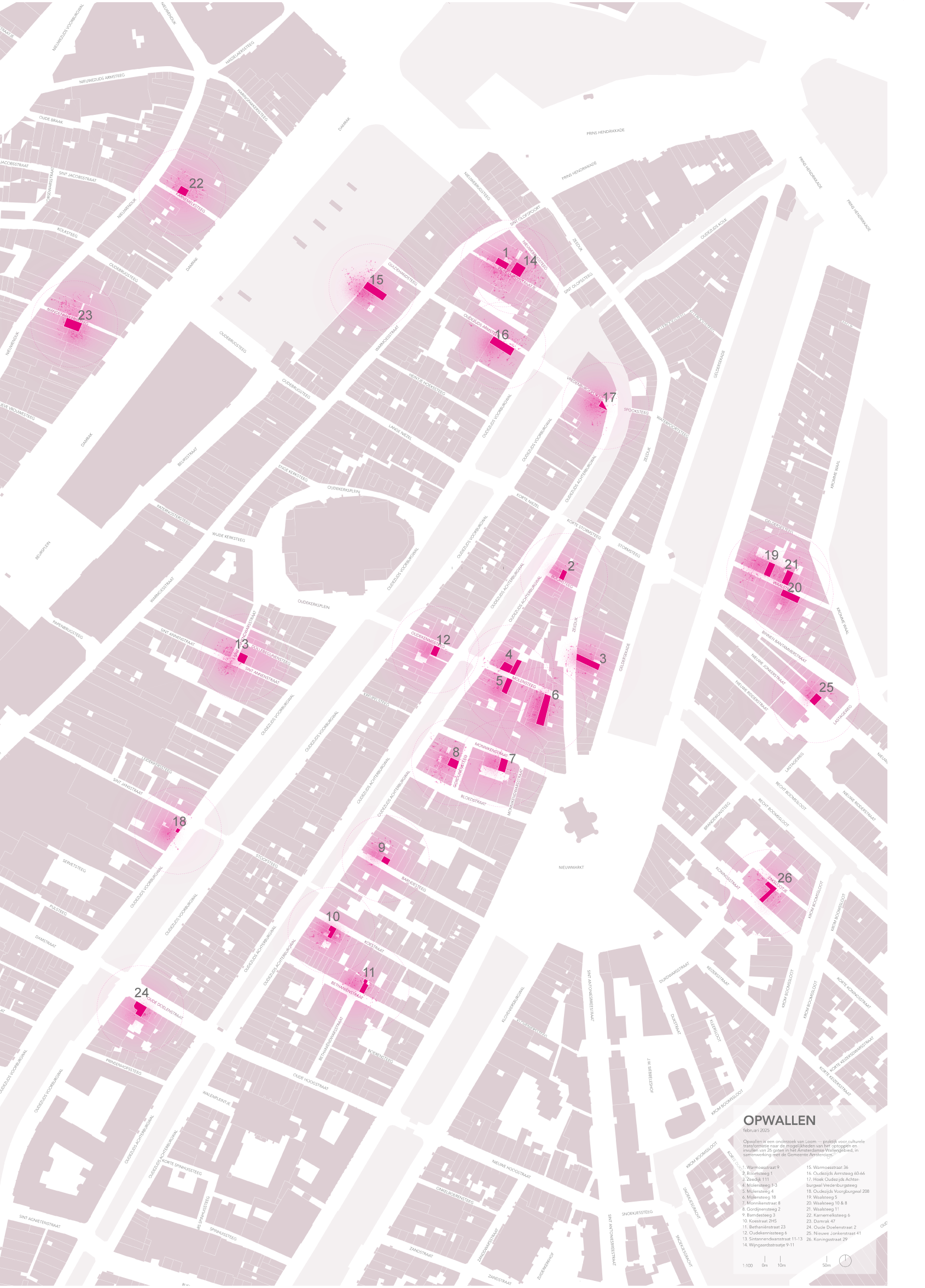 The proposal ‘Behind the Door, Behind the Window’ starts from the value of emptiness in the city. The 26 ‘gaps’ in the Wallen give streets and alleys their scale and recognisability, much like spaces give structure to a sentence. Historically, emptiness also served a social function, as with the former theatre gate on the Keizersgracht, where the space between gate and theatre acted as a place of gathering and pause. This idea resonates with the Japanese Zen Buddhist concept of ‘ma’ (間), which understands emptiness not as absence but as space for possibility. This notion forms the basis of the design.