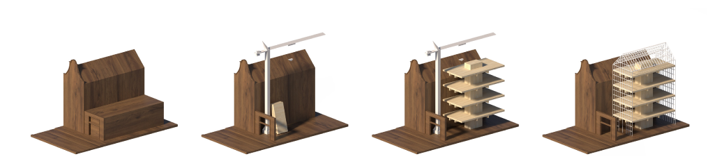 The Wallen district is literally full of gaps. Across dozens of sites, unused space sits above existing one or two-storey buildings. Space for affordable housing and for cultural renewal. The Opwallen project activates this residual space through new architecture and socio-ecological densification, adding a contemporary layer to Amsterdam’s historic city centre. Opwallen is an initiative by Loom, a practice for cultural transformation, and is supported by the Municipality of Amsterdam. HOH is one of the offices invited to translate the initiative into a concrete spatial proposal.