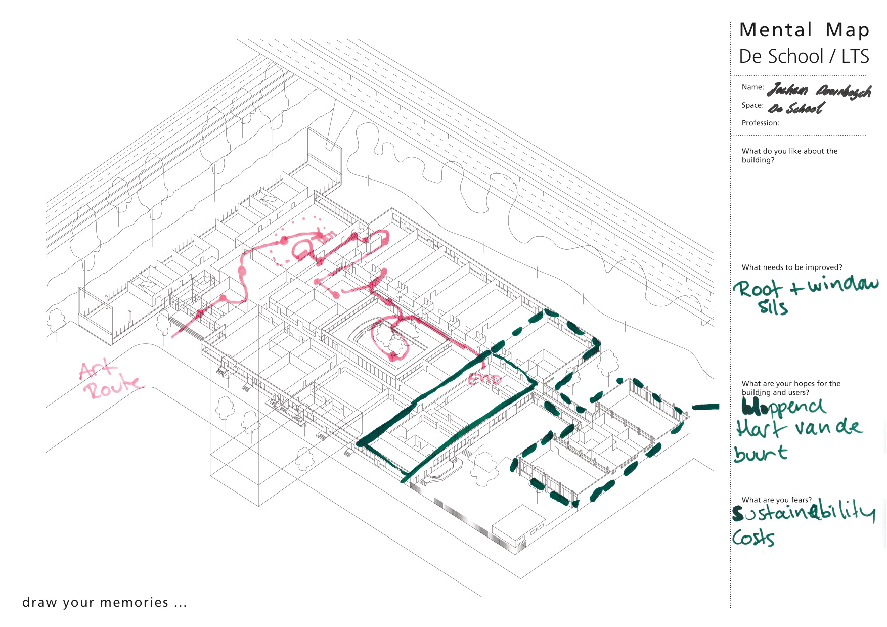 The methodology was applied across different scales and cultures. Firstly to research the De School, situated on the West side of the ring road A10 in Amsterdam. To prevent the demolition of the building, we used the mental mapping technique to bring forward the social values as seen by the users of the building, as well as potentials for its future: from creating an art route, green sequences of spaces and maintaining the materiality. As a result of the process and results, the building was listed and maintained.