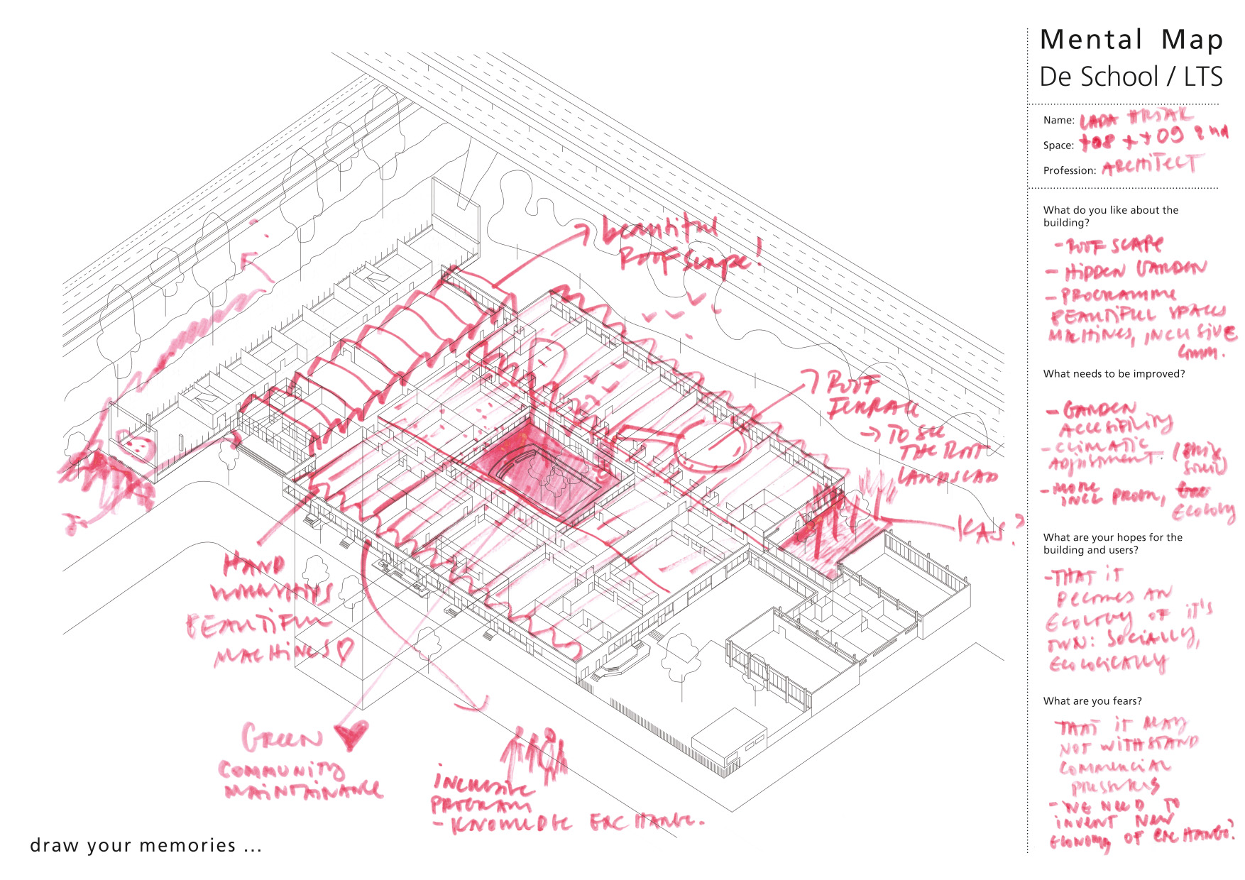 By collecting, analyzing, and synthesizing these mental maps, we can distill the shared values of a building or place from individual perspectives. The mental mapping, as a technique, a bridge between personal values of the users to collective values and into design: transformation, reuse, and the creation of new memories.