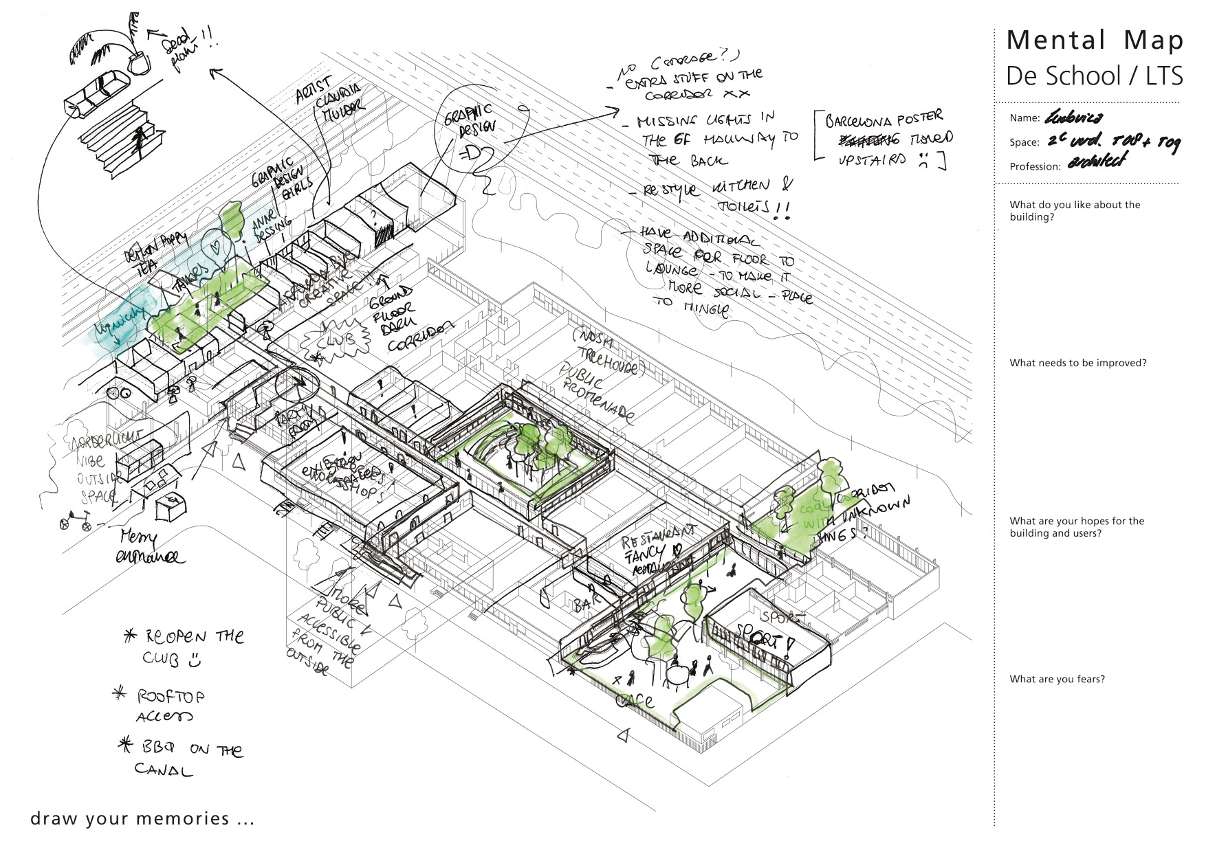 Yet not everyone is an artist, and capturing memories is no easy task. In our surveys, we provide each (re-)user with a drawing, a blank axonometric representation of the building we are investigating, or a map of the neighborhood. On these drawings, participants are invited to draw all their memories of the space and place. Additionally, we ask four simple questions: What do you appreciate about the building/area? What don’t you like about the building/area? What are your hopes for the building/area? What are your fears for the building/area?